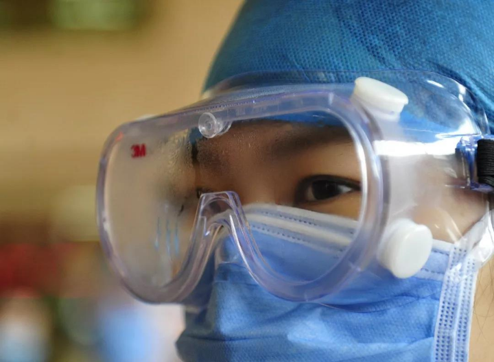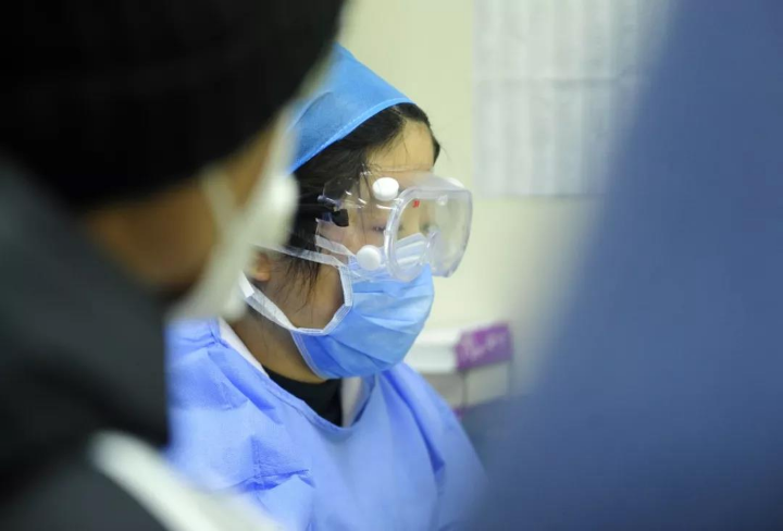 1月27日,在沧州市中心医院预检分诊处,医务人员对每名进入医院的人员进行体温检测,一位医务人员的防护镜已被“汗水”打湿。(苑立伟摄)