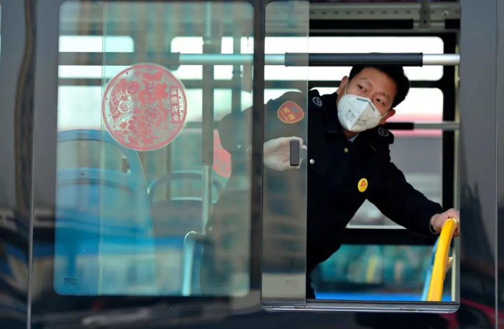 1月25日(大年初一)一名公交司机利用始发和终点站停车间隙打开车窗为车厢通风。(苑立伟摄)