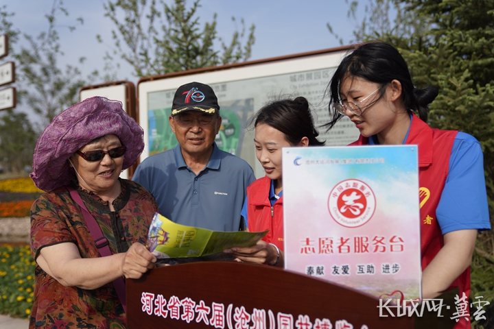 志愿者在园博园发放景区宣传手册。长城网·冀云客户端记者 崔上 摄