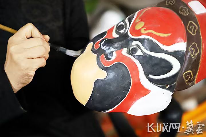 工作室里,刘艳霞正执笔为一尊脸谱勾描眉眼。毛笔起落间,150年的技艺传承也和着屋外的雨声静静流淌。