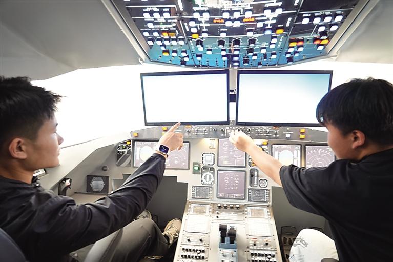 中捷机场,飞行员手提黑色手提箱,整齐来到训练机旁,经过一系列检查核对操作后,飞机启动,缓慢滑入跑道,继而冲向云端。跑道的另一侧,模拟飞行室内,几名飞行学员在飞行教员的指导下,进行实操培训。